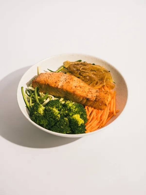 El plato para cuando quieres darte un gusto de verdad. Salmón al horno sobre arroz integral con almendras, zucchini, zanahoria, brócoli y cebolla caramelizada, bañado en emulsión de cilantro. Añade aguacate por $4.000, te lo recomendamos. ⚠️ Contiene pescado, almendras y soya.